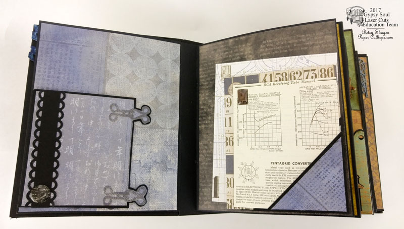 Begin by cutting a fold-out cover from decorative cardstock. I chose a cardstock that featured a latch design. Using a die, cut a decorative trim from black cardstock and adhere it to the front. Adhere this cover to black cardstock and trim 1/8" around three sides of the fold-out. However, on the side that will attach to the page, create a flap by leaving an additional three inches of black cardstock.